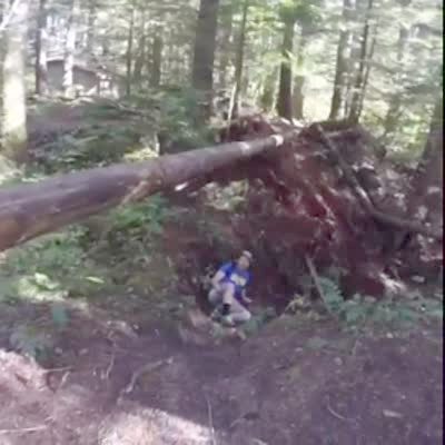 A man crosses a log, then slips and falls onto the ground in a forest.
