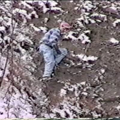 A woman walks on a log across a stream in the woods and then climbs up a steep hill on the other side of the stream. As the woman gets towards the top of the hill at 1:15, she slips and falls down the hill.