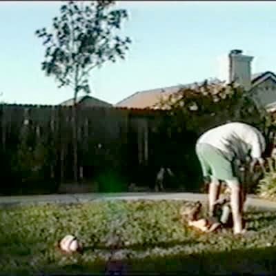 A man throws a football on the ground in the backyard for a gender reveal party. The ball bounces, hits his father-in-law in the face, covering him in blue powder.