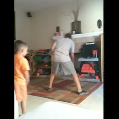In a living room, a boy is about to hike a football to his tot brother. His tot brother runs up and kicks him in the crotch. Short heads. Short tails. Kids.