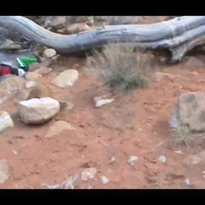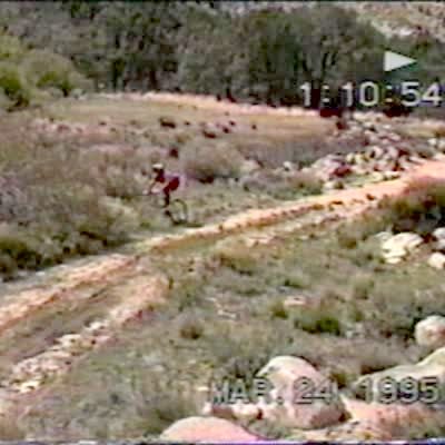 A woman tries to swing on a vine branch and falls in a dirt trench. Short tail.
