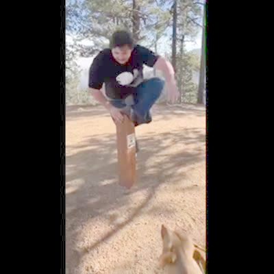 A man on a hike tries to stand on a wooden post and balance, but fails. He runs at the post, hits his groin, and flips forward.