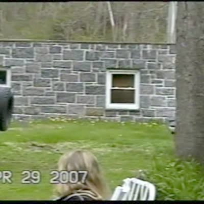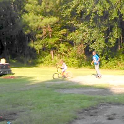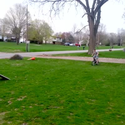 A boy rides a bicycle in a back yard to test out a homemade ramp. It breaks apart as he rides it and he falls off his bike. A woman gets upset and the boy behind the camera gets excited.