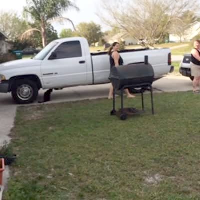 Teen on Big Wheel rides up homemade ramp that sits on barrels and falls off .