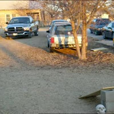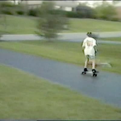 Man rides a moped off a homemade jump / ramp and falls on the driveway.