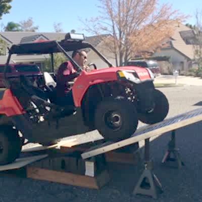 An adult man tries to drive an ATV up a homemade ramp but the ramp breaks and the vehicle falls back outdoors.
