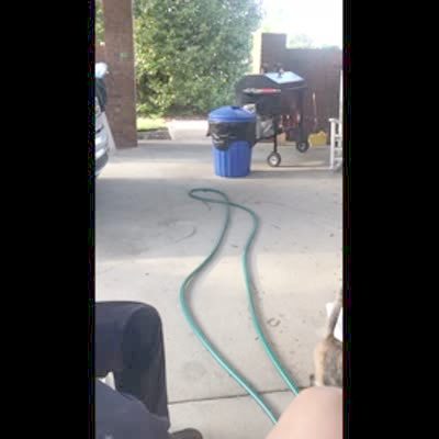 A clever dog turns on a water hose so it can bite the water that sprays out.