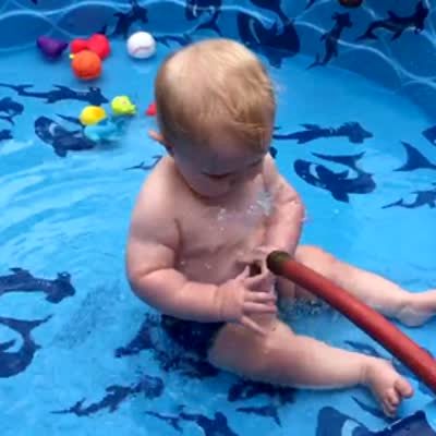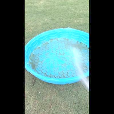 A dog drags a kiddie pool around the backyard as a man chases him with a water hose.