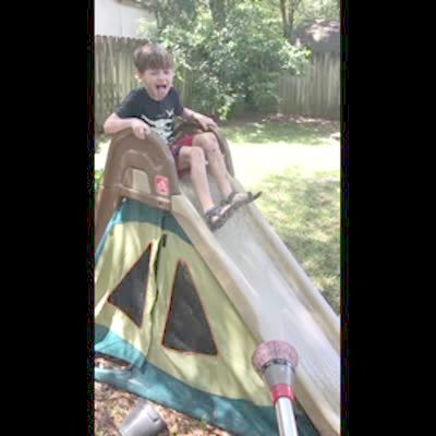 A young boy goes down a slide while his mother sprays water from a hose. At the bottom of the slide, another young boy holds a pot that the first boy runs into head first. Short tail.