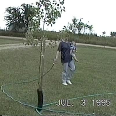 A man waters the grass in a backyard, then says "ow," hits himself in the face, and runs away when a wasp bug stings him. Security footage.