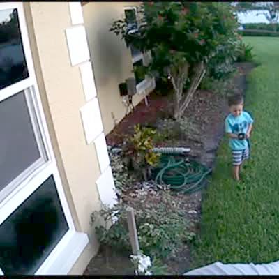 A young boy turns on a hose and lets go of it on a driveway, then he screams and runs while it moves around and sprays water everywhere. Security footage.