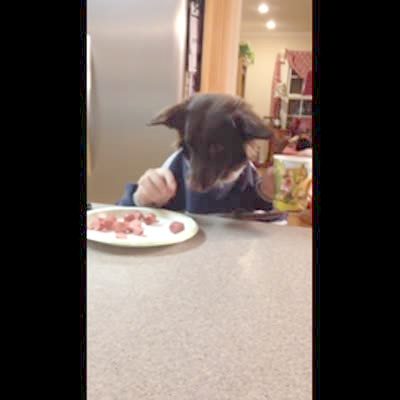 A dog with human hands eats pieces of a hot dog and drinks from a cup at a kitchen table.
