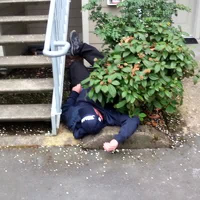 A man climbs on the side of a building outdoors, falls down into a bush, and laughs.