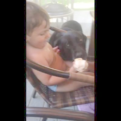 A young kid tells a tot girl to do a belly flop into a kiddie pool in a yard. She does it with an ice cream cone still in her hand. The tot girl stands up in the pool and continues to eat the ice cream. The young boy yells "oh my God!"