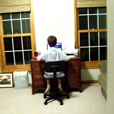 Young boy gets caught dancing in his parents' home office with music on the computer. Is surprised.