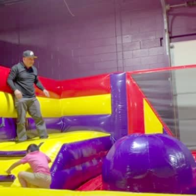A man falls at an indoor park when he slips as he jumps onto a large inflatable ball.