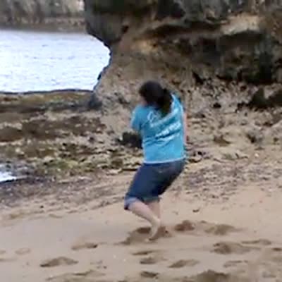 Teen girl tries to throw a large piece of driftwood into the lake. The wood spins and hits her in the face.