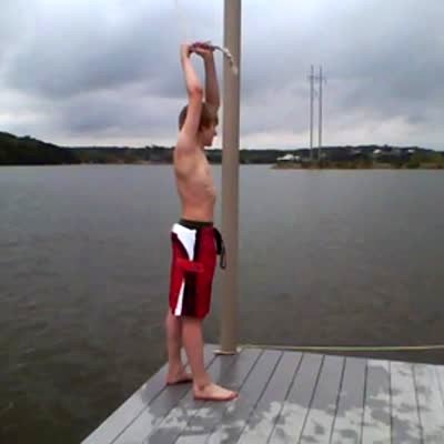 Teen boy tries to swing on a rope onto a raft. He holds on too long and swings back onto the dock, hitting his groin on a pole. Crotch hit.