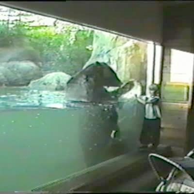 A man tries to pick up a pair of sunglasses that is in front of a baboon monkey exhibit but the baboon slaps the glass and floor to stop him.