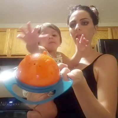 A woman hands a "spill proof" bowl to a tot girl and food immediately falls out of the bowl in the kitchen.