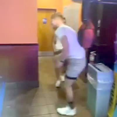 A young man tries to kick a punching bag at an arcade, but he misses and kicks a game machine.