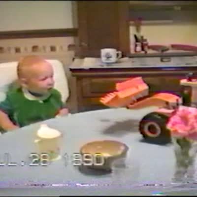 Remote Control Feeding. Boy is fed by toy truck. Great Visual.