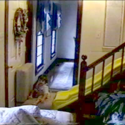A young boy slides down a homemade staircase slide, then it breaks and he screams "my booty!"