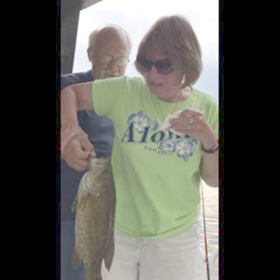 A man holds a fish and a woman grabs on to it and tells the man to get behind her and pretend that he is not there as she poses to the camera.