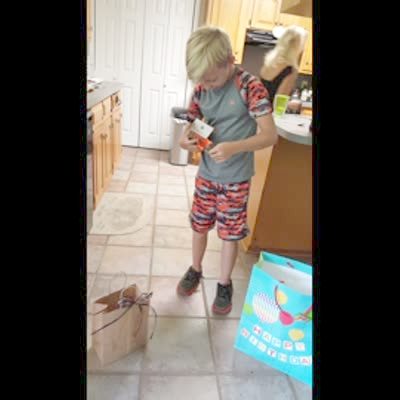 A young boy gets an iPhone for his birthday and drops it on the floor when he opens the box.