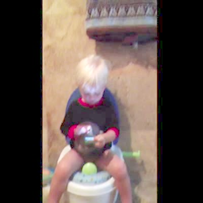 A tot boy sits on the toilet using his moms iPhone when he drops it in. Action at :18.