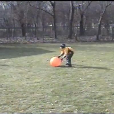 Boy puts a big ball in front of brother's toy Jeep. Boy runs over ball & flips the car over. Sibling rivalry.