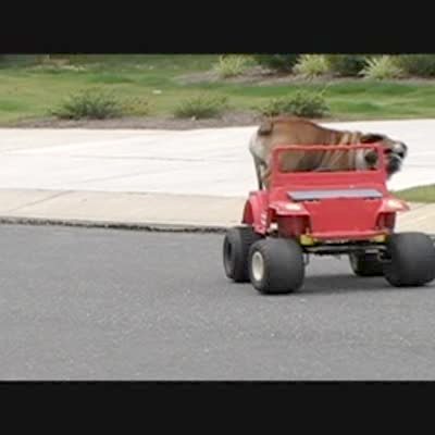 Bulldog rides red kid's jeep toy car around in the street. Dog