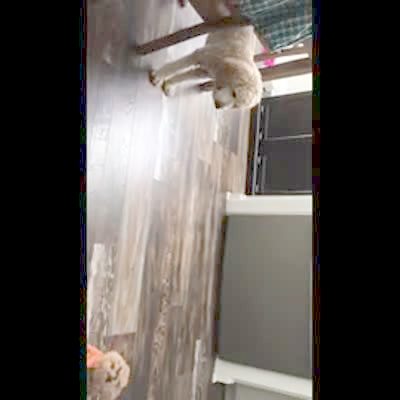 "Canine Camera Caper" A doodle dog jumps over a baby gate at home, then he uses his paws to turn a security camera around. TikTok video. Security footage.