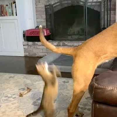 A kitten cat jumps to play with a dog's tail and she turns around scares the cat who runs away in a living room.