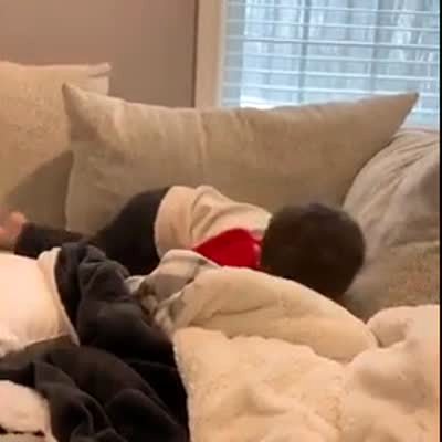 A woman does the what the fluff challenge for her dogs in the hallway, and after she throws the blanket up, one of the dogs jumps up and grabs it. She runs into the bedroom and the two dogs walk around until they find her.