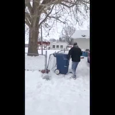 A man climbs up onto a fence around a porch and stands on it and tries to jump but it breaks and he faceplants in the snow and a woman laughs in the backyard.