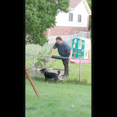 "Dog's Best Friend" Lab dog jumps on boy in yard while boy tries to get a basketball that has gone over the fence. The dog tries to hump the boy vigorously.