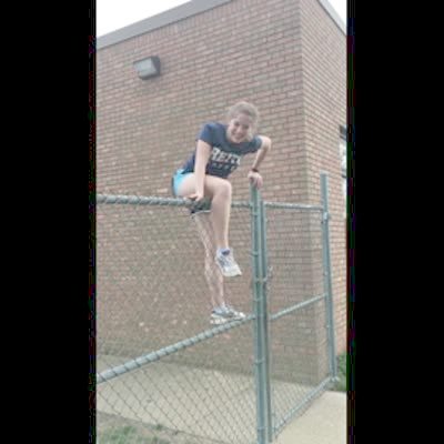 A teen girl climbs over a fence and gets stuck. She jumps down and rips her shorts on the fence.