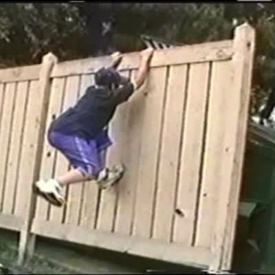 A man struggles to climb over a fence in the yard. At the end, he just flips over the fence and falls on the ground.