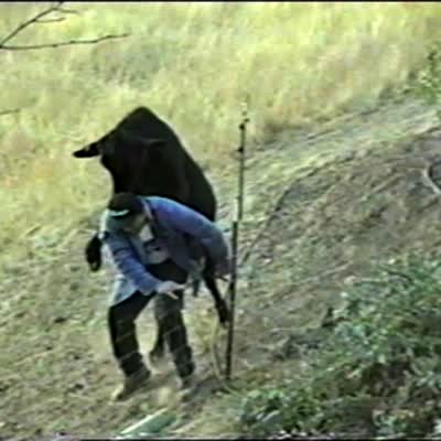 Cow / bull jumps on man's back while man works on fence. Surprises man. Man tries to run away. Outdoors, farm.