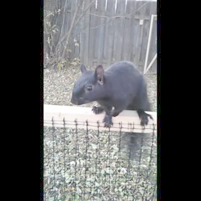 A black squirrel on a fence jumps at the camera and collides with it.