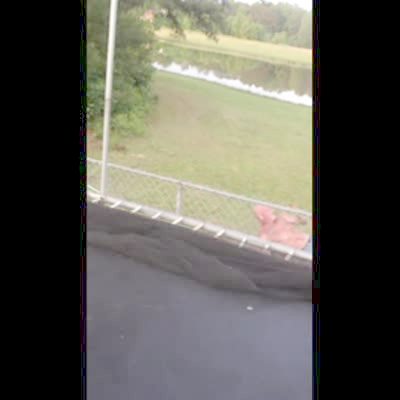 A man lays a young boy on an partially deflated bounce house and jumps on it and launches him over the fence in the backyard. Security footage.