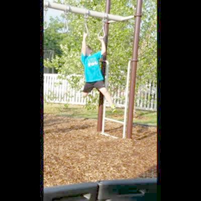 A young boy hits his groin on a ladder rung when he drops off monkey bars.