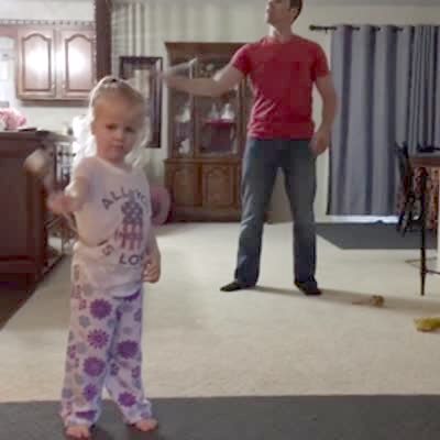 A tot girl plays with a baton. In the background, a man hits himself in the groin with a baton.
