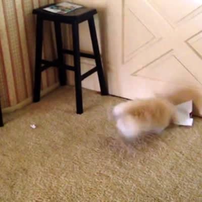 A young girl attempts to walk towards a chair with a Cheeto on it. She gets close to it and then a slightly older girl runs in and eats the cheeto and takes the chair away.