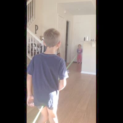 A young boy stands over a long stretched out band while his tot sister stretches it then lets it go indoors. It snaps into his groin and he falls down.