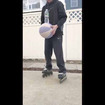 A young boy in a driveway stands on roller-skates and drops a basketball with a water bottle onto the ground and the bottle bounces back up and hits him in the junk.