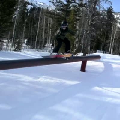 Young boy skiis down a hill. He does one trick perfectly and then slips and lands on his crotch during the second trick.