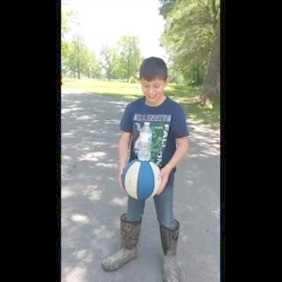 A young boy fails at doing a bottle flip on basketball and the water bottle hits him in the groin.