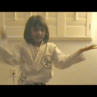 Young girl in karate outfit karate dances to "Kung Fu Fighting" song, she spins around and hits head / face into a wall. She's fine; recovery.
